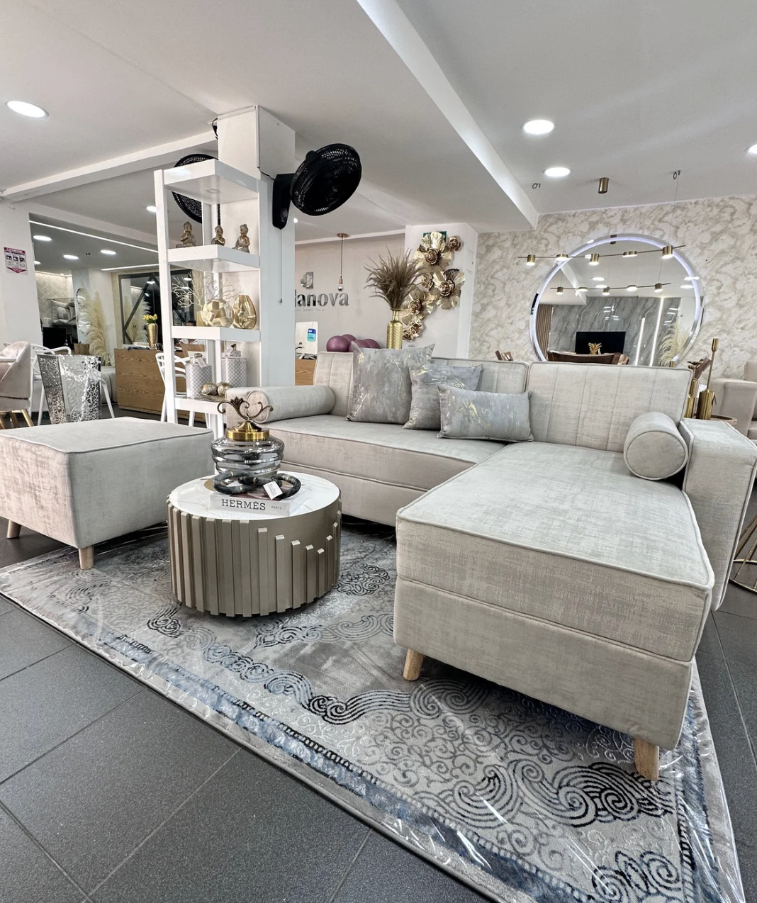 Este sofá esquinero combina líneas limpias con una distribución funcional que aprovecha al máximo el espacio. Su diseño amplio y simétrico crea un ambiente ordenado y acogedor, ideal para reuniones o momentos de descanso. La combinación de cojines decorativos y detalles cilíndricos añade un toque distintivo que equilibra sobriedad y sofisticación.